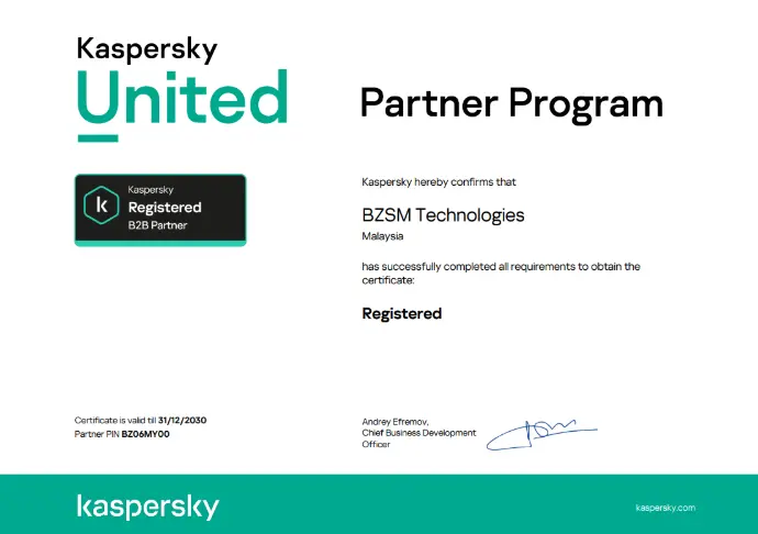 We are proud to announce that BZSM Technologies has been officially recognized as a Kaspersky Registered B2B Partner under the Kaspersky United Partner Program.